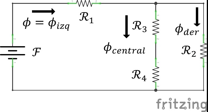 Para determinar la reluctancia total, se observa que al momento de determinar las longitudes de cada parte del núcleo (incluyendo el entrehierro), se asignó al mismo tiempo la reluctancia. Entonces, relacionando el núcleo y sus reluctancias con un circuito eléctrico sencillo, se tiene lo siguiente (figura 1.1.5)