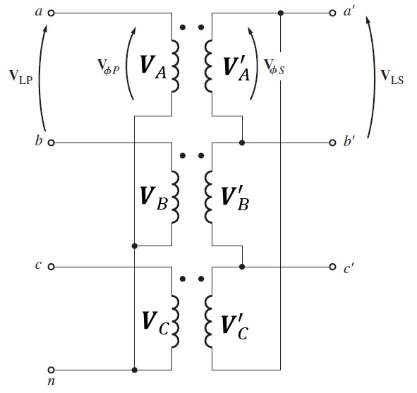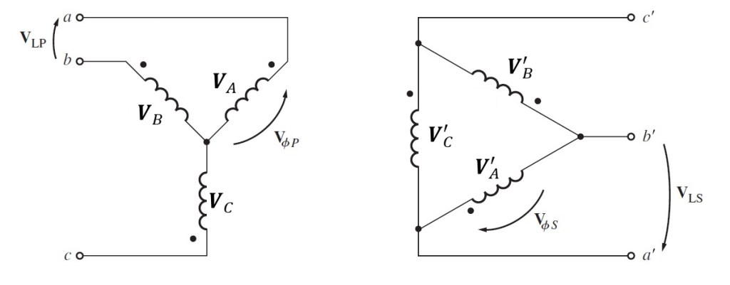 Problema. Pruebe que el sistema trifásico de voltajes en el secundario del transformador que se muestra en la siguiente figura retrasa 30° el sistema de voltaje trifásico en el primario del transformador.