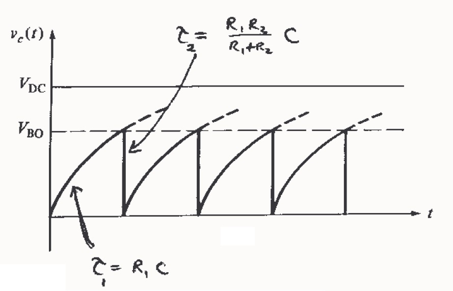 muestran el mismo aspecto durante la parte ascendente del ciclo. Después, de que el diodo PNPN dispare, los voltajes a través del capacitor, decae con una constante de tiempo