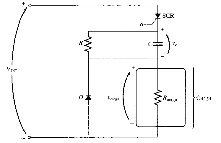 Problema. Un circuito recortador de conmutación forzada con condensador en serie alimenta una carga puramente resistiva como se muestra en la figura.
