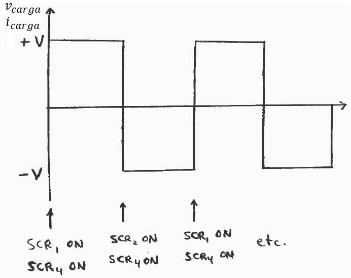 La frecuencia de salida de este circuito rectificador inversor es controlado por las velocidades en que los SCR son activados. La forma de onda del voltaje y corriente resultante (asumiendo la carga resistiva) se muestran a continuación.
