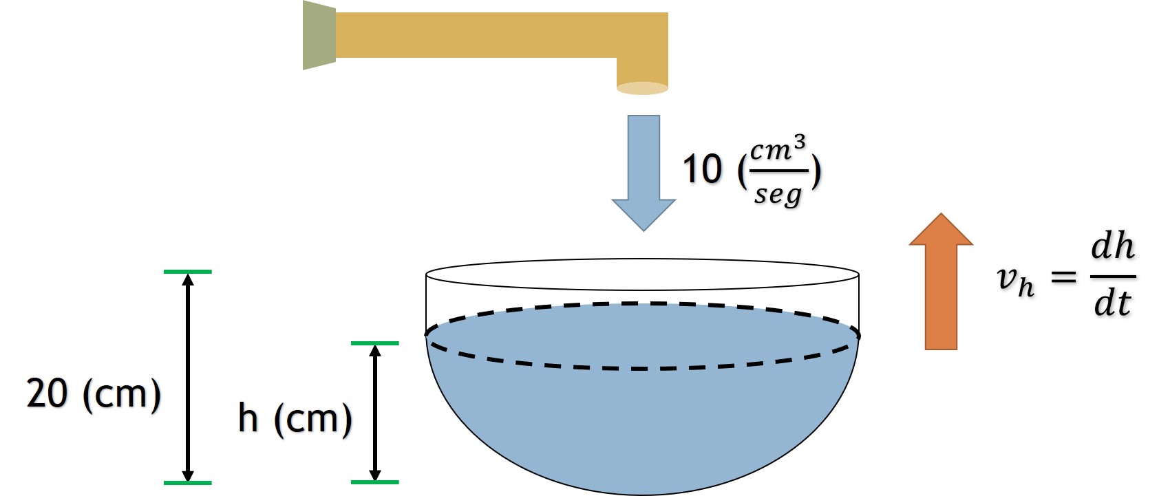 Problema. Se vierte agua en un recipiente hemisférico de 40 (cm) de diámetro a razón de 10 (). Calcular a qué velocidad se eleva el nivel del líquido cuando está a la profundidad del hemisferio.