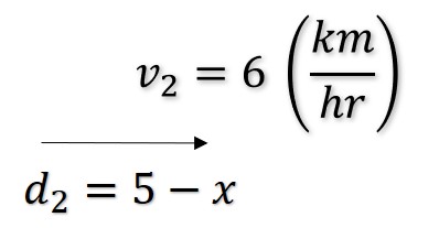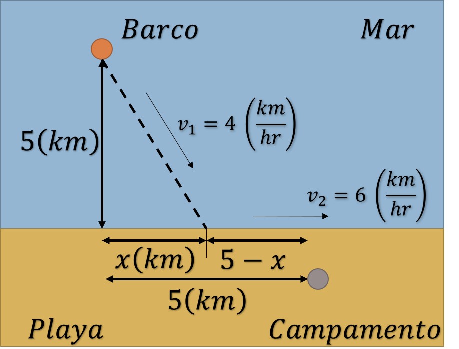 Problema. Hay un barco anclado a 5 (km) del punto más cercano a una playa rectilínea. Se desea enviar un pasajero hasta un campamento situado a 5 (km) a lo largo de la playa a partir del punto más próximo al barco. El pasajero puede remar a razón de 4 (km/hr) y caminar por la arena de la playa a 6 (km/hr) ¿Cuál será el tiempo más corto posible de viaje del barco al campamento?