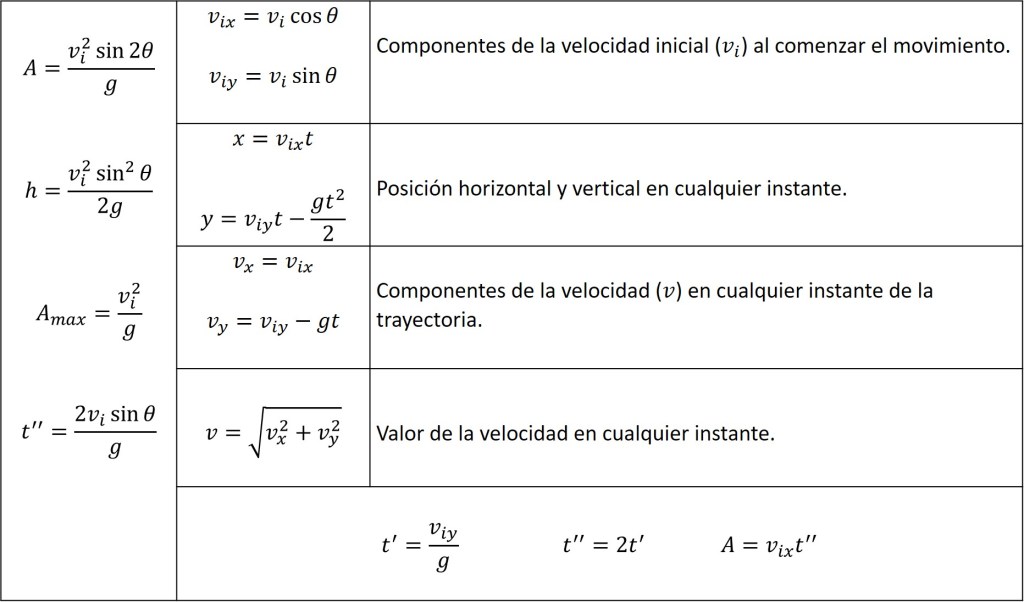* Alcance máximo. Es la mayor distancia horizontal que recorre el proyectil. Se consigue exclusivamente para un ángulo de 45 grados.