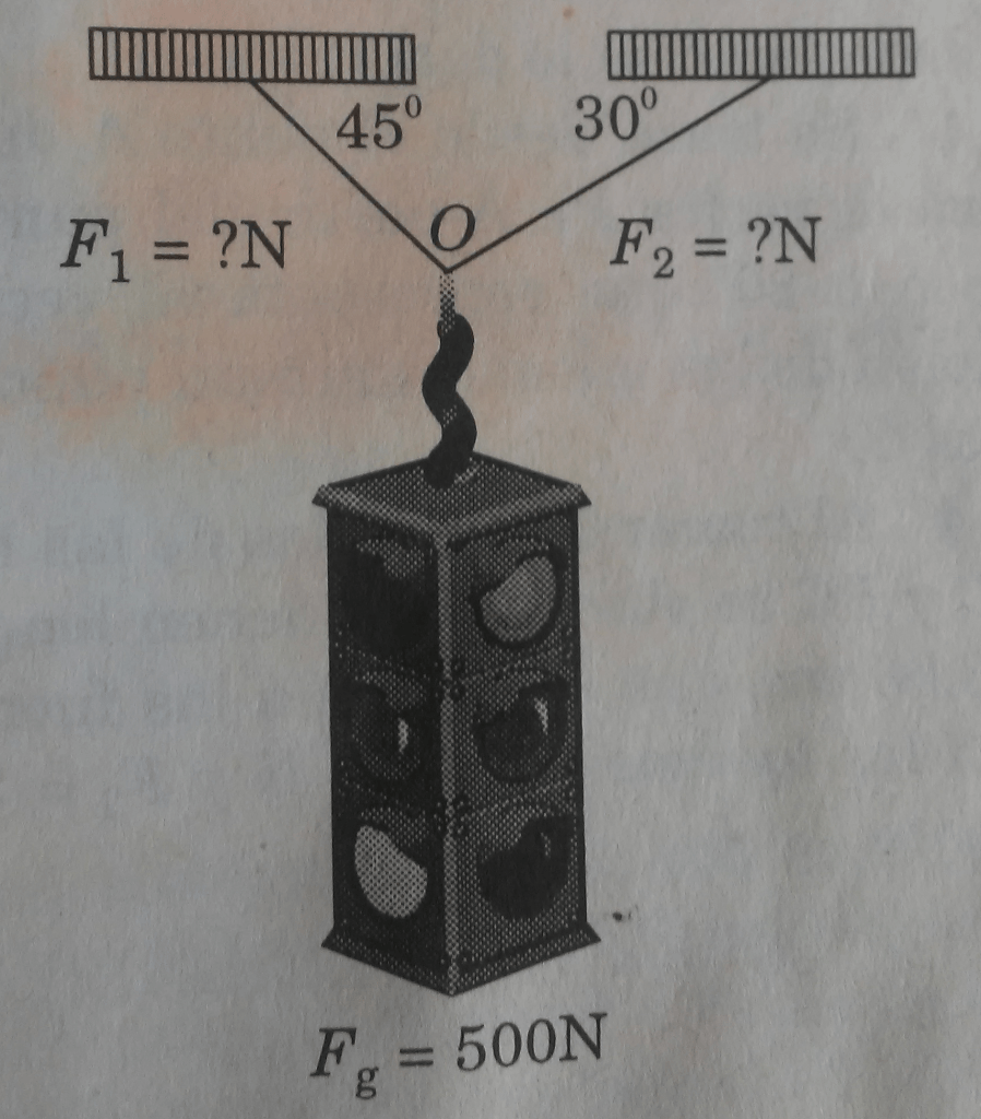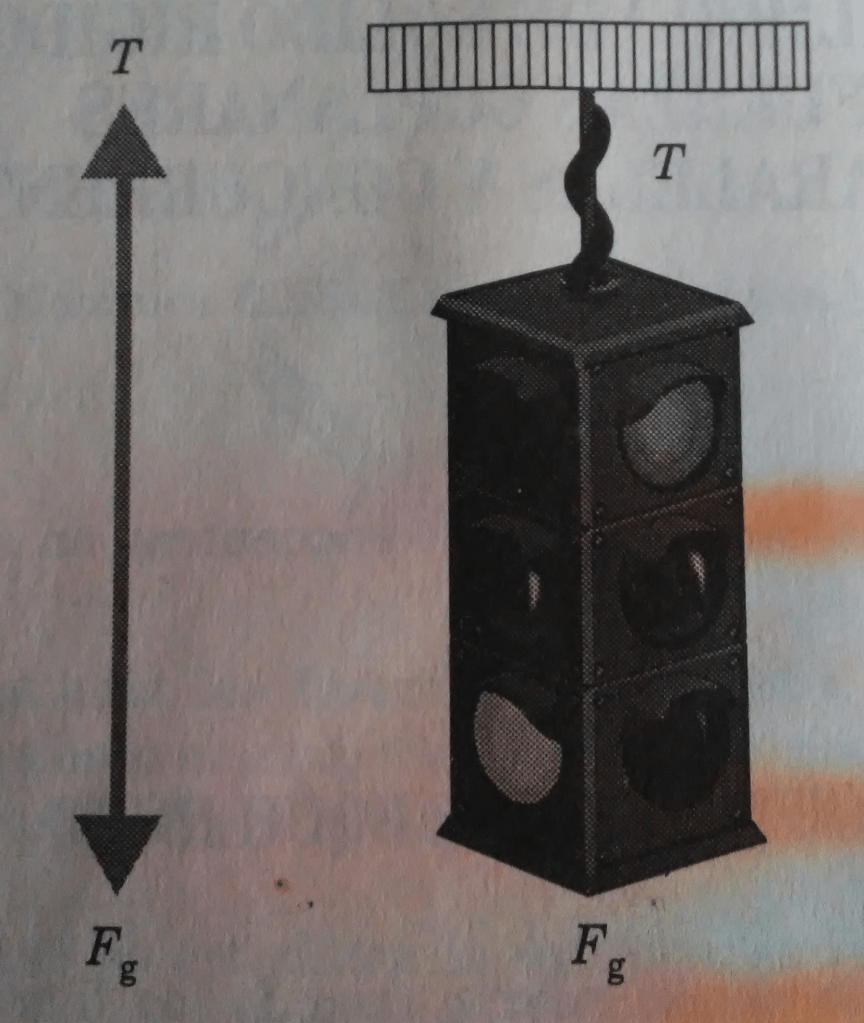 Un ejemplo de fuerzas en equilibrio sería un semáforo colgado del techo. La fuerza hacia abajo o peso () está equilibrada por la tensión del cable hacia arriba. Aquí, las fuerzas son iguales en magnitud y opuestas en sentido.