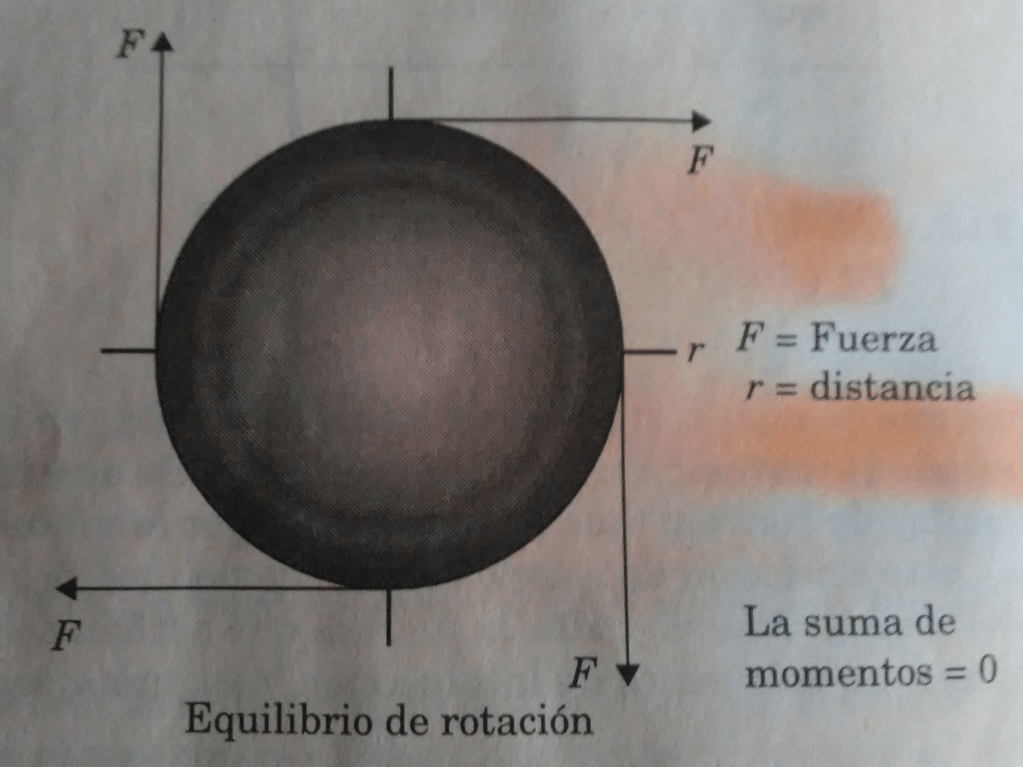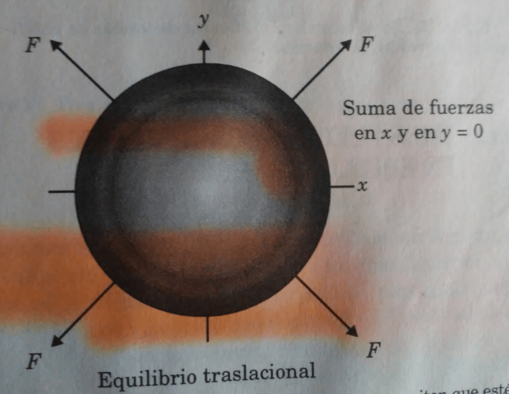 Un cuerpo que se considera en equilibrio, puede estar en reposo o en un estado de movimiento rectilíneo uniforme. De acuerdo con la Primera ley de Newton, esta condición de estado sólo se puede modificar si se aplica una fuerza. Cuando todas las fuerzas que actúan sobre un cuerpo tienen un solo punto de intersección y su suma vectorial es igual a cero, el sistema permanecerá en equilibrio. En la figura 3 se observa que el equilibrio traslacional; el cuerpo se desplazará sobre una línea de acción sin tener un equilibrio rotacional, por lo que es necesario considerar el punto de aplicación, la magnitud y el sentido de las fuerzas.