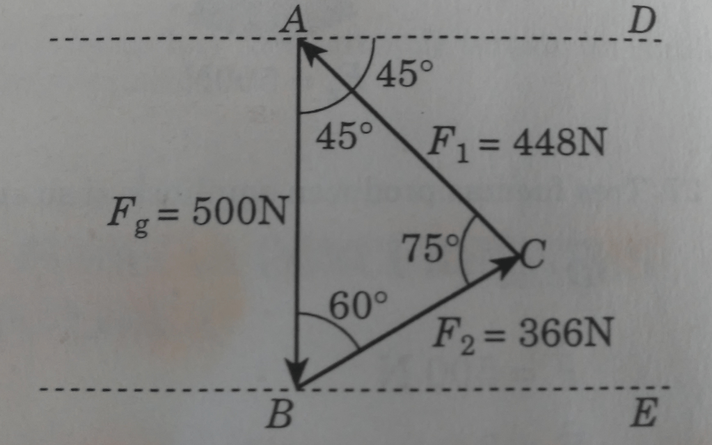 - Al tomar las medidas de las líneas continuadas AC y BC se observa que tienen longitudes de 4.48 cm y 3.66 cm, que equivalen a las fuerzas y sus valores. Son las fuerzas