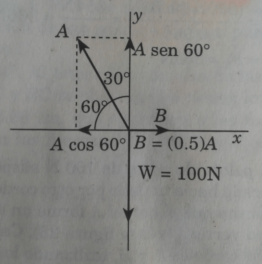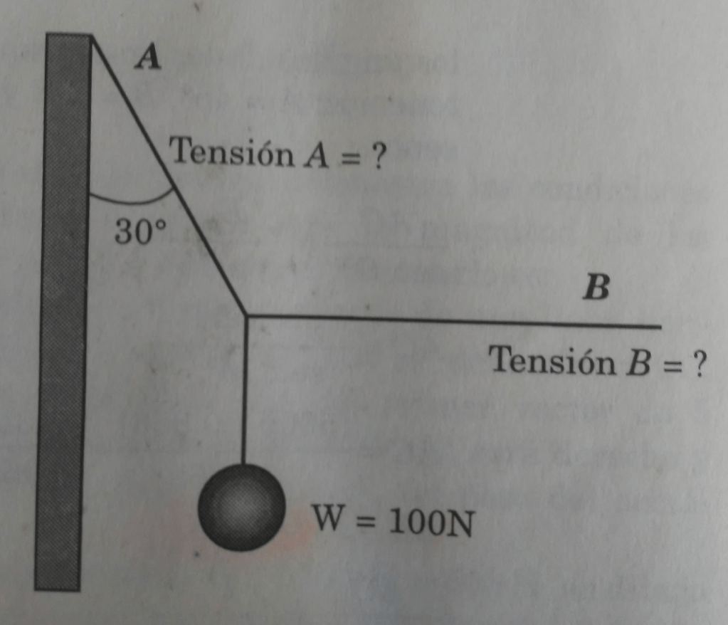 Problema 2. Una pelota de acero de 100 N suspendida del cordel A es tirada hacia un lado por otro cordel B y mantenida de tal forma que el cordel A forme un ángulo de 30° con la pared vertical. Calcular las tensiones de los cordeles A y B, utilizando los métodos: a) de las componentes y b) del polígono.