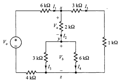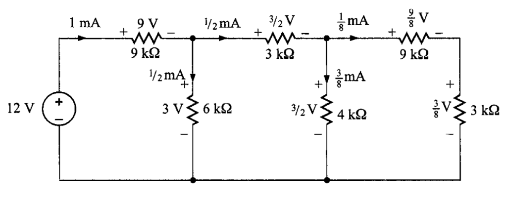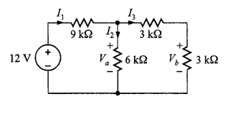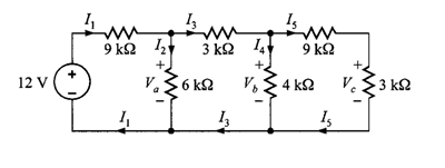 Solución. El análisis comenzará en el extremo derecho del circuito, combinando los resistores para determinar la resistencia total vista por la fuente de 12 V. Esto ayudará a calcular la corriente . Después podrán calcularse todas las corrientes y voltajes de la red aplicando las leyes de Ohm, LKV y LKC o división de voltaje y corrientes.