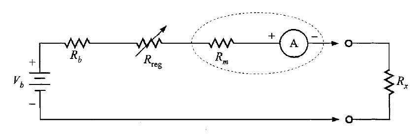 Un óhmetro es un instrumento utilizado para medir la resistencia. El circuito de un ohmétro, mostrado en la figura 1, consiste de un indicador de medición en serie con una batería y una resistencia reguladora. La escala del medidor lee en ohms de derecha a izquierda (figura 2). Si , significa que los cables o terminales del óhmetro están abiertas y por tanto, no hay deflexión del medidor. Si