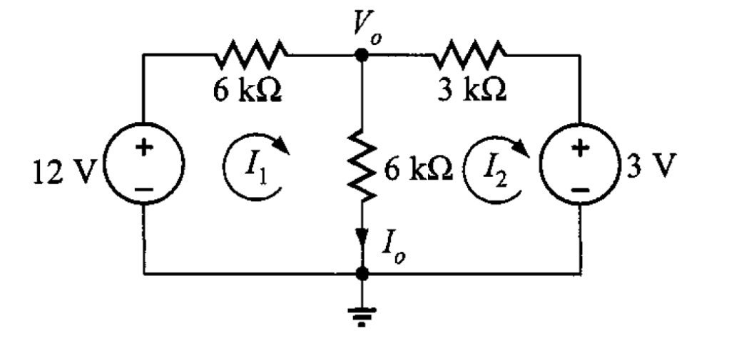 Solución. Se desarrollará el análisis escribiendo las ecuaciones de malla. Se observa que no hay signos «+» y «-» en los resistores. Sin embargo, no son necesarios, ya que se aplicará la ley de Ohm a cada elemento resistivo al momento de escribir las ecuaciones de LKV. La ecuación para la primera malla es