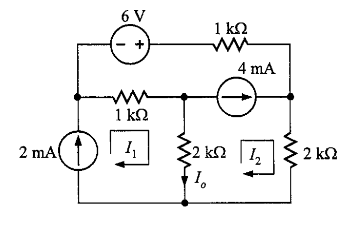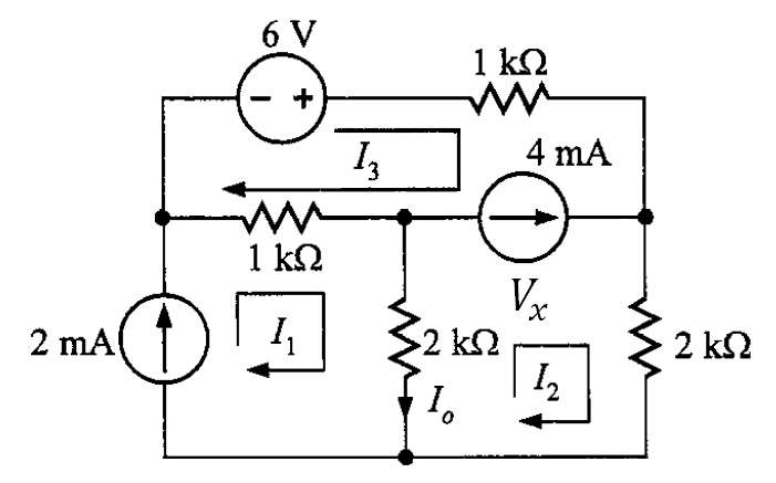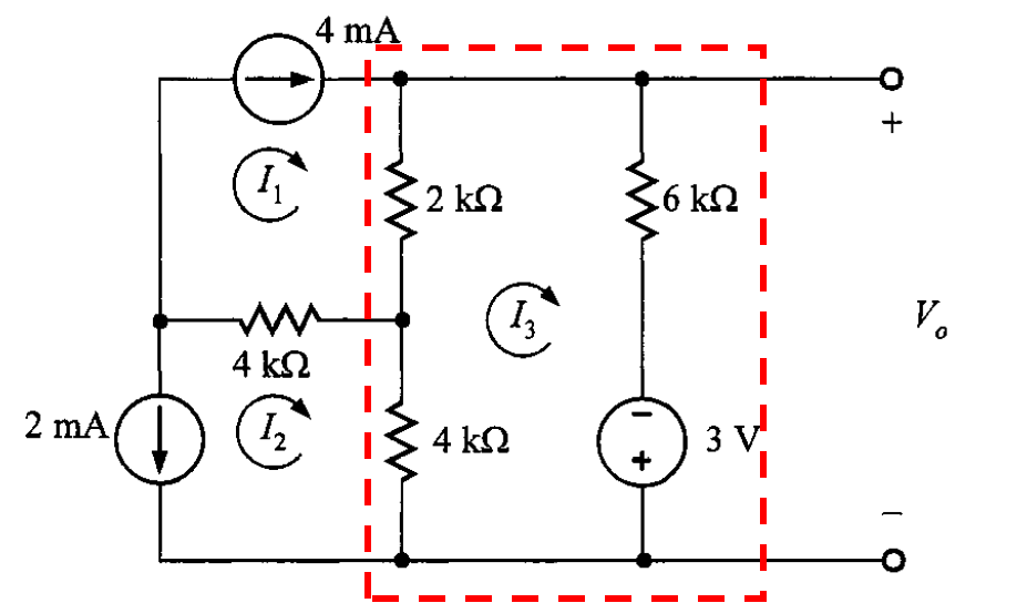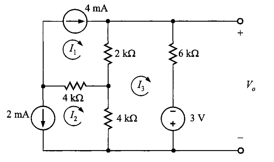 Solución. En este caso se especifican las tres corrientes de malla como se muestra en la figura 8, y dado que no se conoce el voltaje de la fuente de corriente de 4 mA, se asignará como .