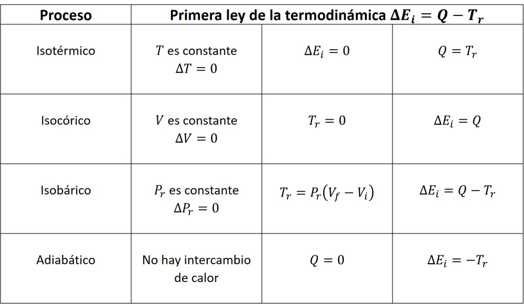 A continuación se muestran las condiciones que se cumplen para los cuatro procesos termodinámicos descritos hace un momento.