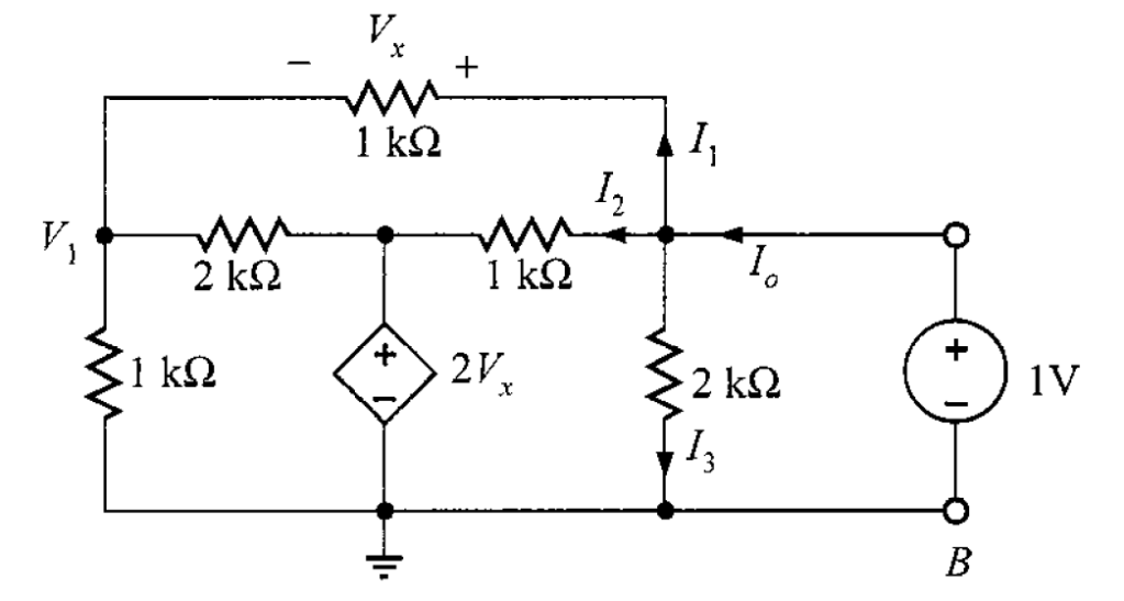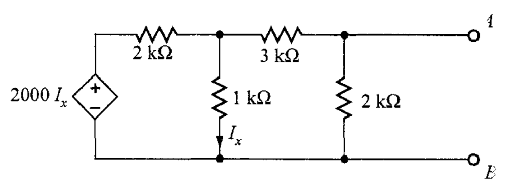 Solución. Para resolver este problema se conectará una fuente de corriente de 1 mA entre las terminales A-B, y con esto ayudará a calcular el voltaje de la terminal y posteriormente