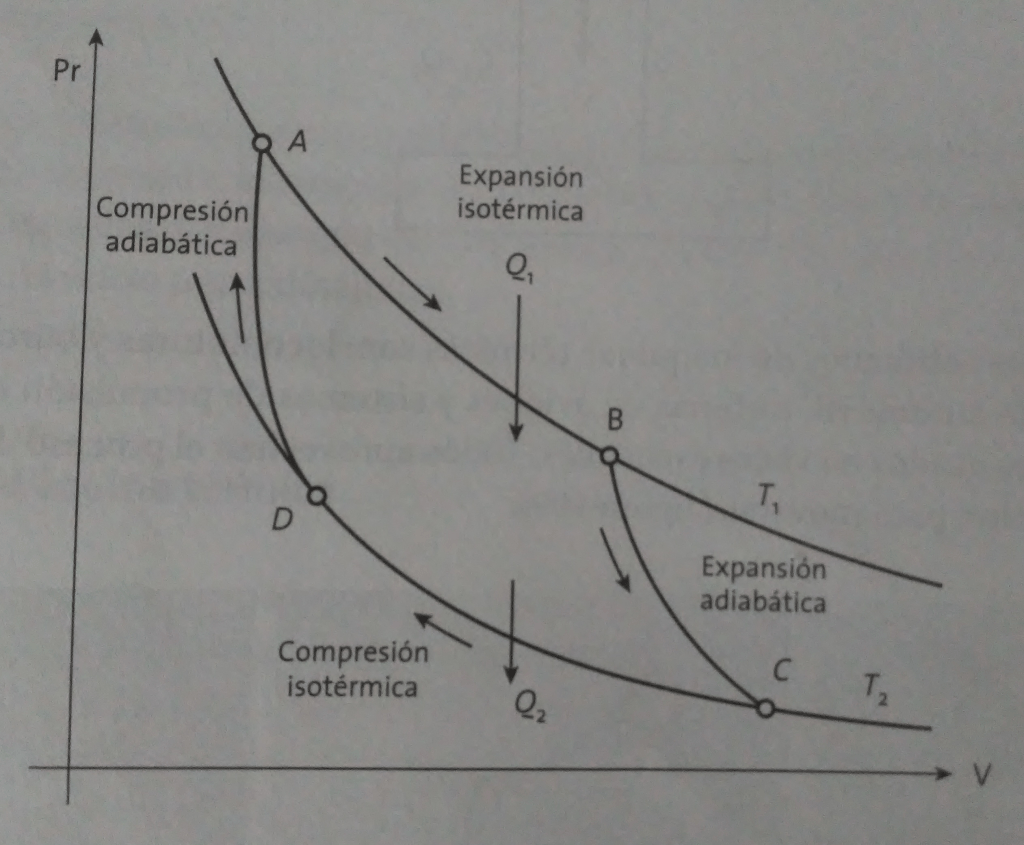 . Finalmente en la cuarta etapa, la curva DA, se presenta una compresión adiabática para regresar a las condiciones iniciales.