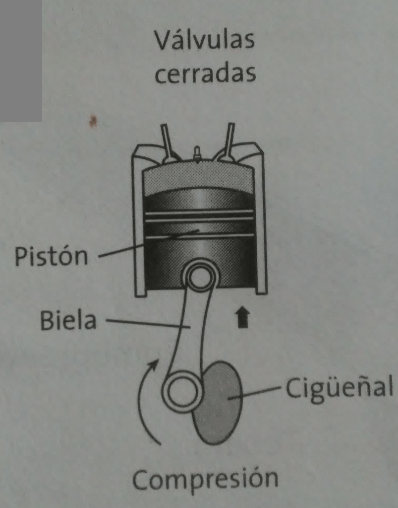Por ejemplo, un motor de combustión interna de cuatro tiempos describe el ciclo siguiente. Primero, el émbolo baja absorbiendo combustible y aire a través de una válvula de admisión. El segundo tiempo es la compresión. Aquí, la válvula se cierra y el émbolo se desplaza hacia la parte alta del cilindro quedando atrapada la mezcla de combustible y aire. A continuación se produce una explosión por la chispa eléctrica procedente de la bujía de encendido que provoca una violenta dilatación de los gases que empujan ahora al émbolo hacia abajo, y que al estar sincronizado con el cigüeñal, realiza trabajo mecánico. El cuarto momento lo constituye el escape de los gases resultantes de la combustión, cuando el émbolo asciende y se abre la válvula de escape. El diagrama de presión-volumen se muestra en la figura.