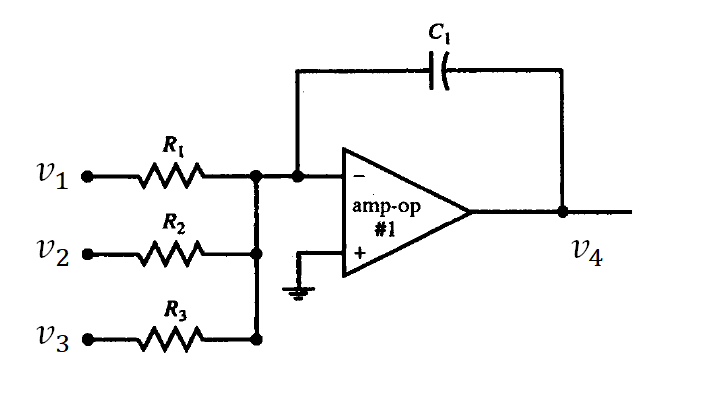 Paso 2. Se tomará un amplificador operacional circuito sumador de integrales (que en este caso serán de tres entradas). Recordando la fórmula y su circuito (figura 1)