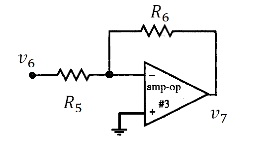 Para conectar la entrada del primer amplificador con la salida del segundo es necesario que la salida sea negativa, es decir, sea . Una solución sería diseñar un tercer amplificador operacional de tipo circuito inversor. Recordando la fórmula y su circuito (figura 7).