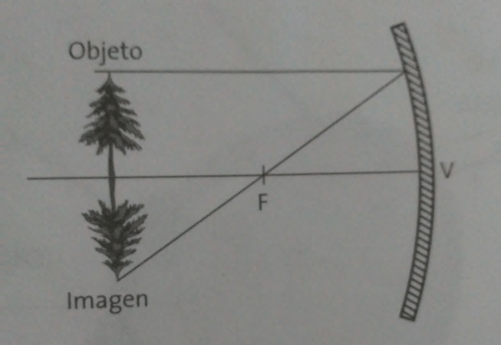 La imagen que se obtiene al colocar el objeto después del centro de curvatura es real, invertida, de menor tamaño que la original y se localiza entre el foco y el centro de curvatura.