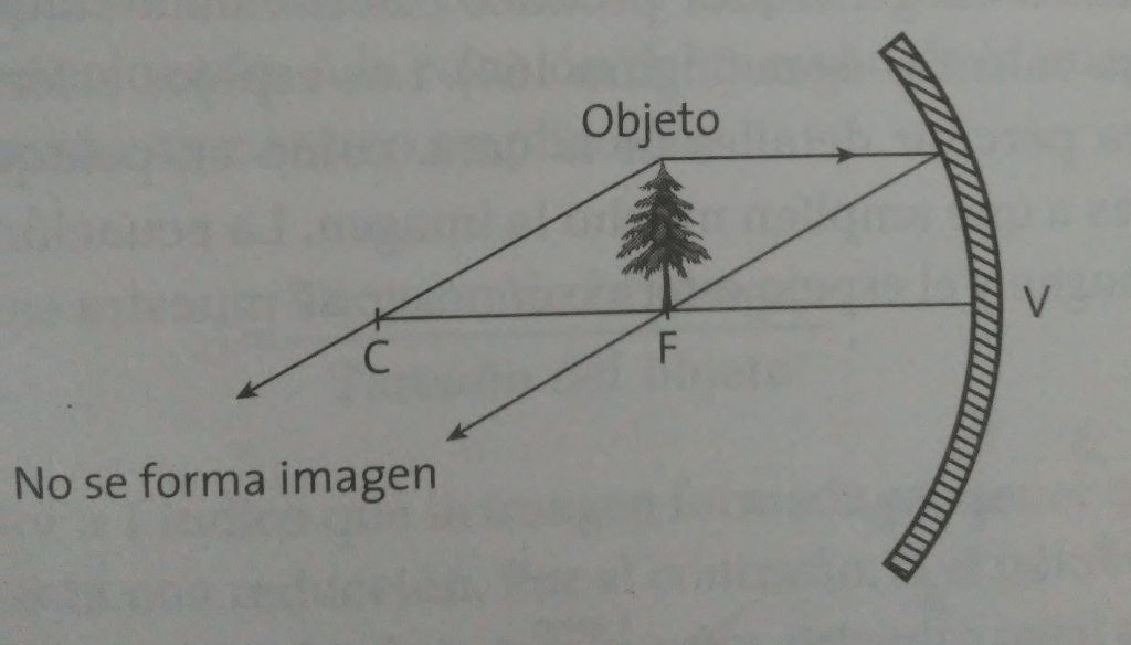 La imagen no se forma cuando se coloca el objeto en el foco, debido a que no se cumple el requisito fundamental para la formación de imágenes, que se corten por lo menos dos rayos reflejados enviados desde dos puntos extremos del objeto.