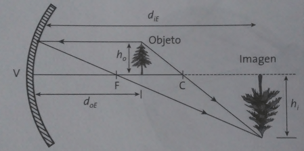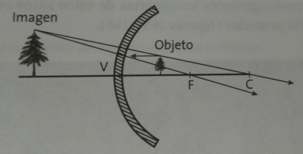La imagen obtenida al colocar el objeto entre el foco y el vértice es virtual, de mayor tamaño que la original, derecha y formada detrás del espejo. Por tanto, dependiendo de la distancia que exista entre el objeto y espejo cóncavo, la imagen real podrá ser mayor o menor.