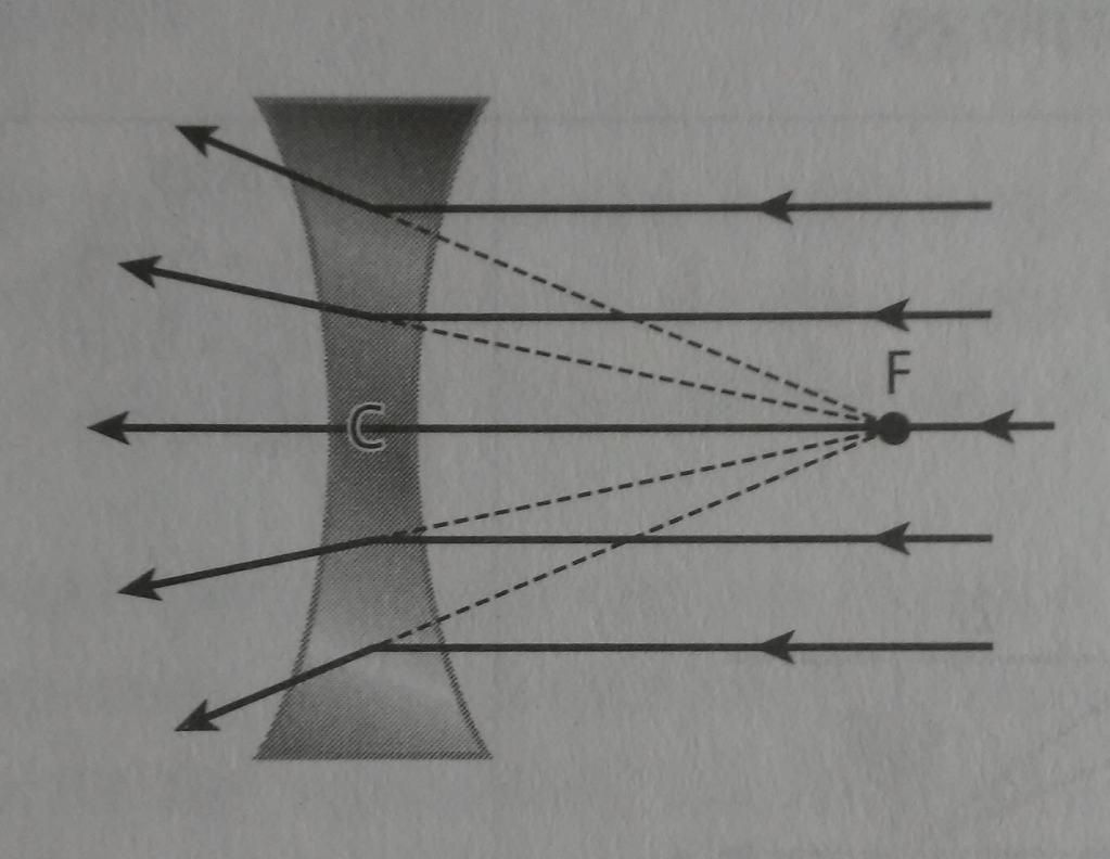 En las lentes divergentes o negativas el espesor disminuye de los bordes hacia el centro, así que los extremos son más gruesos que éste. Se caracterizan por que los rayos paralelos al eje principal se separan al refractarse y dan la impresión de que producen del mismo foco principal. Hay tres tipos de estas lentes: bicóncava, plano cóncava y menisco divergente. el uso de alguna de ellas será consecuencia del tipo de imagen que se requiera lograr o problema que se deba corregir.