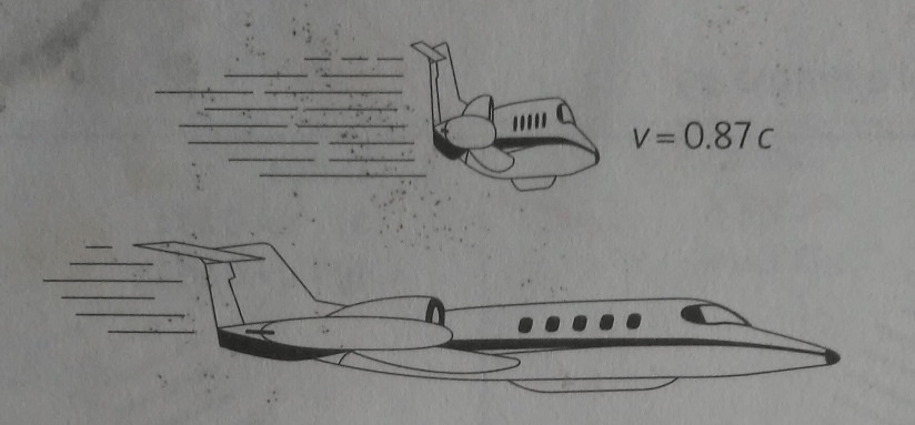 La interpretación a lo anterior es que cuando la nave alcanza 87% de la velocidad de la luz (), se contrae a la mitad de su longitud original [