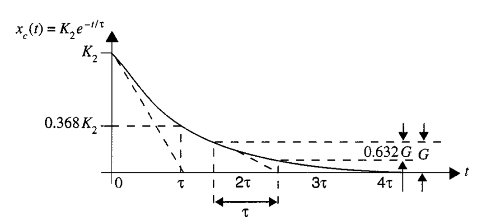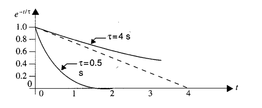 Una propiedad interesante de la función exponencial que se observa en la figura 1 es que la pendiente inicial de la curva intersecta el eje de tiempo a un valor de , que también se puede tomar cualquier punto sobre la curva, no solo el valor inicial, y se encuentra la constante de tiempo hallando el tiempo requerido para cerrar la brecha un 63.2%. Finalmente, la diferencia entre una constante de tiempo pequeña (es decir, respuesta rápida) y una constante de timpo grande (la cual es una respuesta más lenta) se ilustra en la figura 2. Estas curvas indican que si el circuito tiene una constante de tiempo pequeña, se restablece rapidamente a un valor de estado estable. De manera inversa, la constante de tiempo es grande, se requiere más tiempo para que el circuito se restablezca o alcance el estado estable. En cualquier caso, la respuesta del circuito escencialmente alcanza el estado estable en cinco constantes de tiempo (es decir,